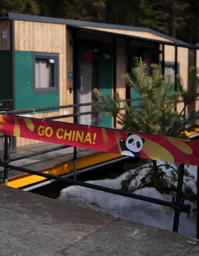 已经入驻的各个代表团都在沿路进行了个性化的装饰,中国代表团横幅上是一只憨态可掬的熊猫举起爪子,旁边写着GO CHINA字样